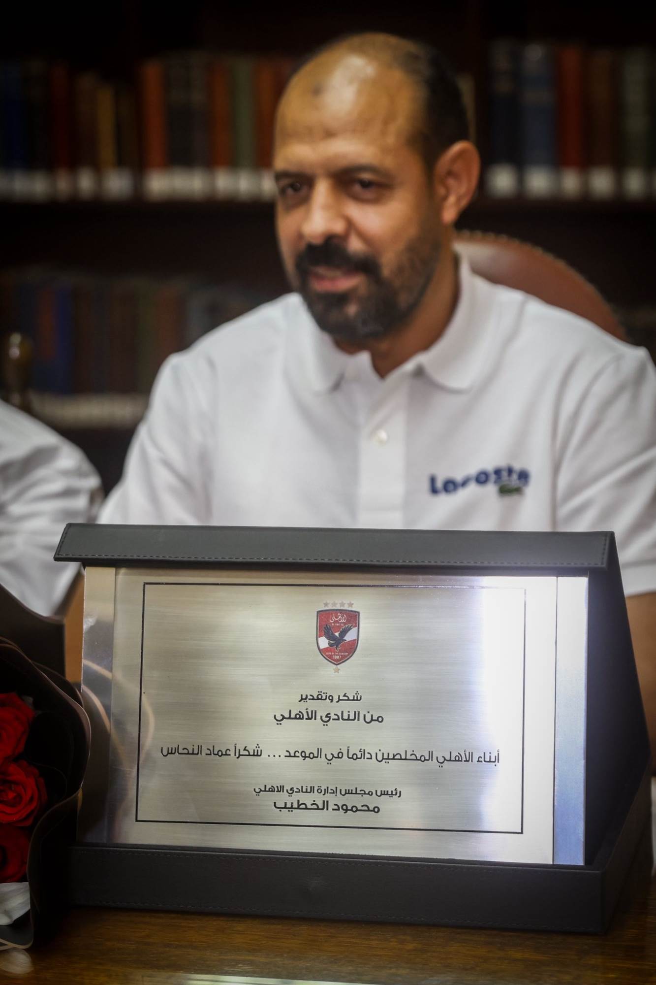 كرم محمود الخطيب، رئيس النادي الأهلي، عماد النحاس؛ تقديرًا لجهوده الكبيرة مع الفريق الأول لكرة القدم خلال الفترة الماضية، بعد توليه المسؤولية الفنية في مرحلة مهمة من الموسم الماضى.