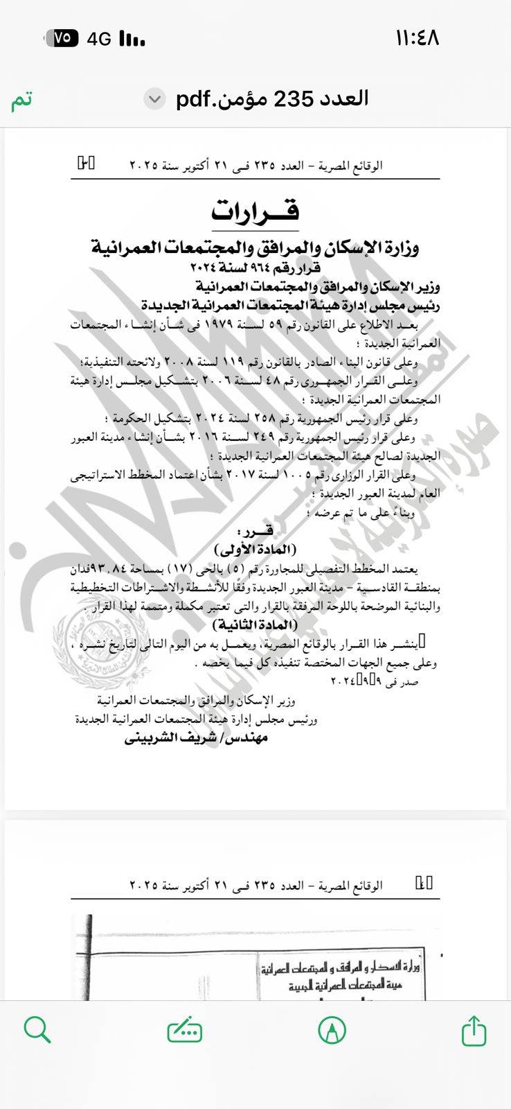 نشرت جريدة الوقائع المصرية، قرار وزير الإسكان والمرافق والمجتمعات العمرانية، بشأن اعتماد المخطط التفصيلي للمجاورة 5 بالحي الـ17 بمنطقة القادسية مدينة العبور الجديدة، وذلك في العدد 235 في 21 أكتوبر 2025.