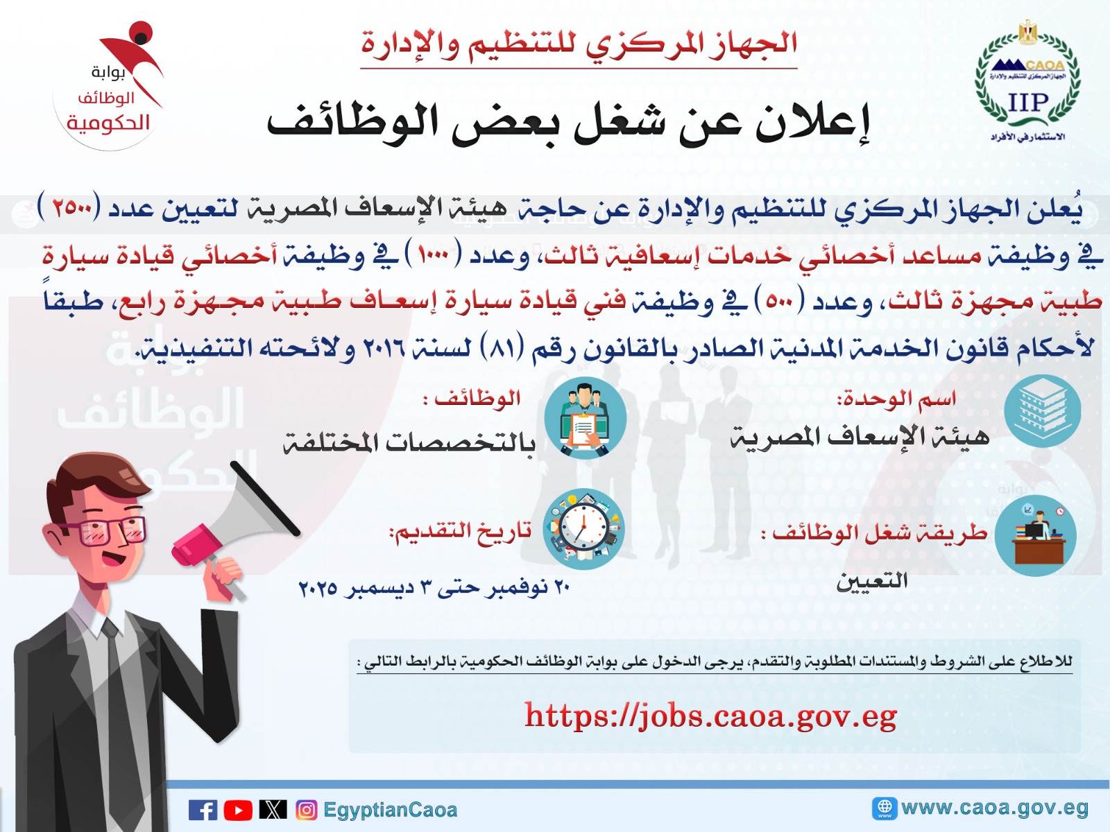 التنظيم والإدارة يُعلن عن مسابقة لشغل 4000 وظيفة بهيئة الإسعاف المصرية