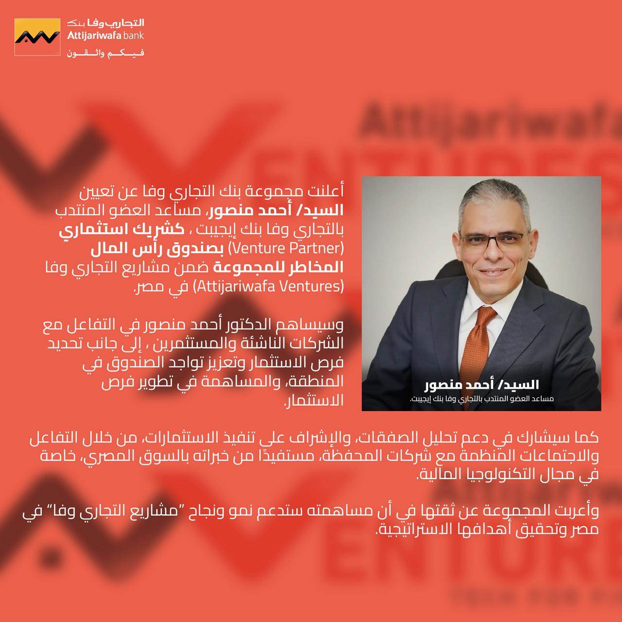 أعلنت مجموعة التجاري وفا بنك، تعيين أحمد منصور، مساعد العضو المنتدب بالتجاري وفا بنك إيجيبت، كشريك استثماري (Venture Partner) بصندوق رأس المال المخاطر التابع لها، ضمن مشاريع التجاري وفا “Attijariwafa Ventures”، في مصر.